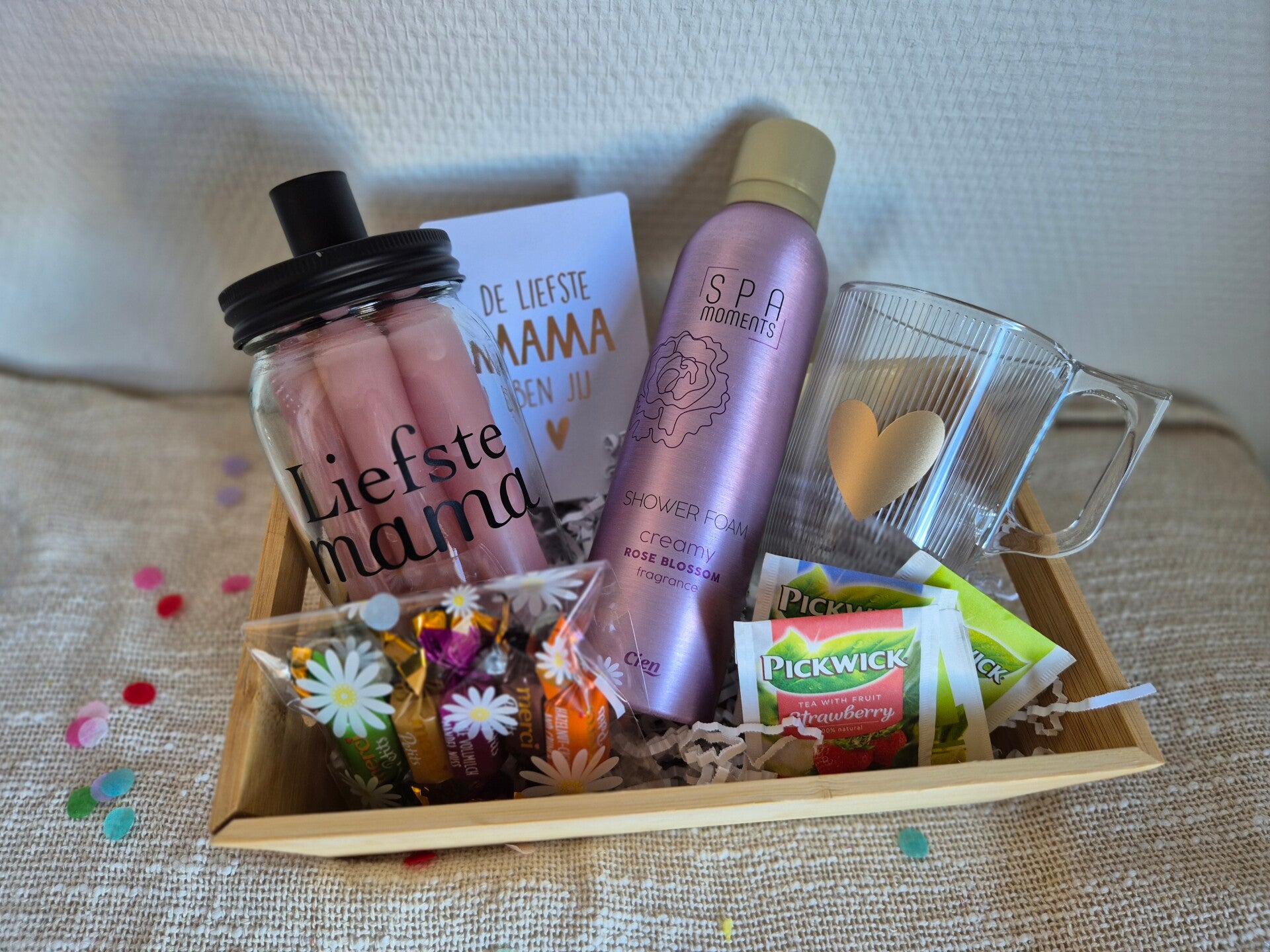 Verras je (schoon)moeder met dit liefdevolle cadeaupakket! Perfect voor Moederdag, haar verjaardag of zomaar – gewoon om te laten weten hoe bijzonder ze is.